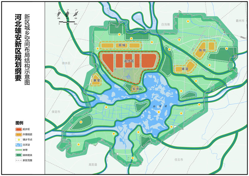 “一主”即起步区,选择容城、安新两县交界区域作为起步区,是新区的主城区,按组团式布局,先行启动建设。“五辅”即雄县、容城、安新县城及寨里、昝岗五个外围组团,全面提质扩容雄县、容城两个县城,优化调整安新县城,建设寨里、昝岗两个组团,与起步区之间建设生态隔离带。“多节点”即若干特色小城镇和美丽乡村,实行分类特色发展,划定特色小城镇开发边界,严禁大规模开发房地产。